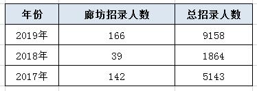 2019年河北省共招錄9158人,其中廊坊共設(shè)62個職位,招錄166人,占總?cè)藬?shù)的1.8%。以下是近三年廊坊地區(qū)的招錄情況: