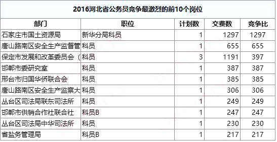 2016河北省考競爭最激烈的崗位為“石家莊市國土資源局新華分局科員”,1297人競爭1個崗位。2015河北省考競爭最激烈的崗位為“共青團石家莊市委科員”,1568人競爭2個崗位。