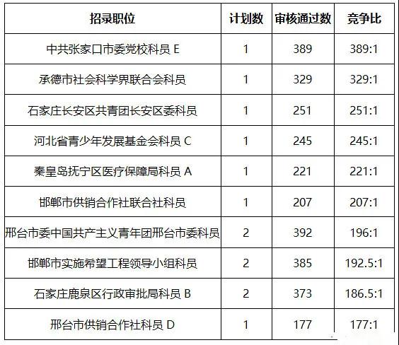 2019河北省考競爭最激烈的崗位為“中共張家口市委黨校科員”,389人競爭1個崗位。其次為“承德市社會科學界聯合會科員”、“石家莊長安區(qū)科員”。