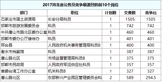 2017河北省考競爭最激烈的崗位為“石家莊市國土資源局長安分局科員”,1505人競爭1個崗位。其次為“邯鄲市旅游發(fā)展委員會科員”、“中共唐山市路北區(qū)委辦公室科員”。