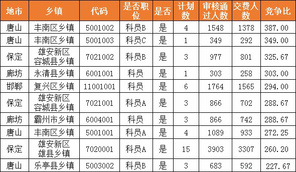 2018年只招錄鄉(xiāng)鎮(zhèn)崗位,2018河北省考競爭最激烈的崗位為“唐山豐南區(qū)鄉(xiāng)鎮(zhèn)科員B”,招錄4個人,1548人報名,387人競爭1個崗位。其次為“唐山豐南區(qū)鄉(xiāng)鎮(zhèn)科員C”、“保定雄安新區(qū)容城縣鄉(xiāng)鎮(zhèn)科員”。