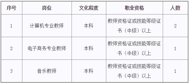 招聘4人,計算機專業(yè)教師2名,電子商務(wù)專業(yè)教師1人,音樂教師1人。要求“文化程度”或“職業(yè)資格”其中一項達(dá)標(biāo)即可,具體見下表: