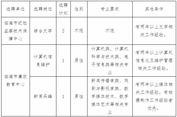 臨海市紀(jì)委市監(jiān)委下屬臨海市紀(jì)檢監(jiān)察技術(shù)保障中心、臨海市廉政教育中心,為公益一類財(cái)政全額補(bǔ)助事業(yè)單位。根據(jù)工作需要,經(jīng)研究,決定面向浙江省范圍內(nèi)公開(kāi)選聘下屬事業(yè)單位工作人員?,F(xiàn)將有關(guān)事項(xiàng)通告如下: