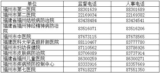 福州市第一醫(yī)院、福州市第二醫(yī)院、福建省福州肺科醫(yī)院、福建省福州神經(jīng)精神病防治院、福州市中醫(yī)院、福建醫(yī)科大學(xué)孟超肝膽醫(yī)院、福州市皮膚病防治院、福州市疾病預(yù)防控制中心、福州市婦幼保健院、福建省福州兒童醫(yī)院、福州市第七醫(yī)院等。