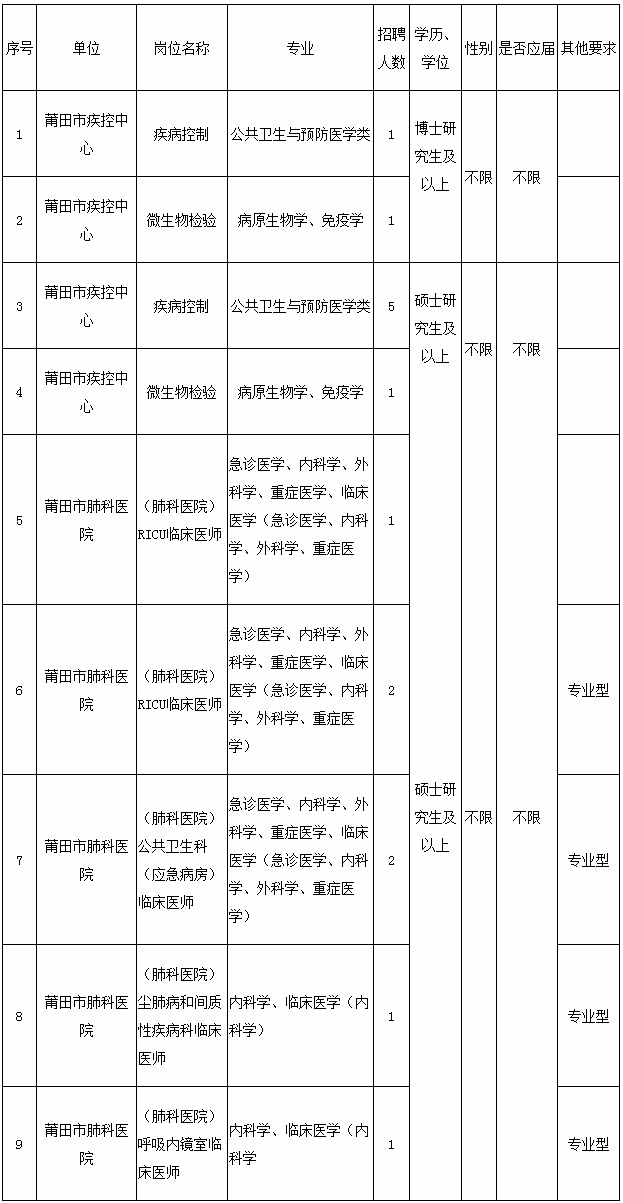 為持續(xù)貫徹落實(shí)中共莆田市委 莆田市人民政府《關(guān)于實(shí)施人才“壺蘭計(jì)劃”的意見(jiàn)》(莆委發(fā)[2017]2號(hào)),積極吸引緊缺專(zhuān)業(yè)人才到我市就業(yè),現(xiàn)莆田市衛(wèi)健委直屬2家醫(yī)療衛(wèi)生單位:莆田市疾控中心(財(cái)政核撥事業(yè)單位)、莆田市肺科醫(yī)院(財(cái)政核補(bǔ)事業(yè)單位),擬向社會(huì)公開(kāi)招聘工作人員15名,根據(jù)事業(yè)單位公開(kāi)招聘有關(guān)規(guī)定,提出如下招聘方案: