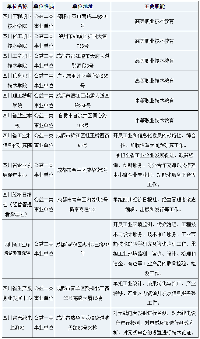 根據(jù)《事業(yè)單位人事管理條例》、《事業(yè)單位公開招聘人員暫行規(guī)定》和《四川省省屬事業(yè)單位公開招聘工作人員實施細則(試行)》等有關規(guī)定,四川省經(jīng)濟和信息化廳擬面向社會公開招聘部分工作人員補充到四川工程職業(yè)技術學院等12個直屬事業(yè)單位工作。現(xiàn)將公開招聘有關事項公告如下(本公告由四川省經(jīng)濟和信息化廳同時在四川省人力資源和社會保障廳官網(wǎng)[rst.sc.gov.cn,下同]“人事考試”專欄和四川省經(jīng)濟和信息化廳官網(wǎng) [https://jxt.sc.gov.cn/,下同]上發(fā)布)。